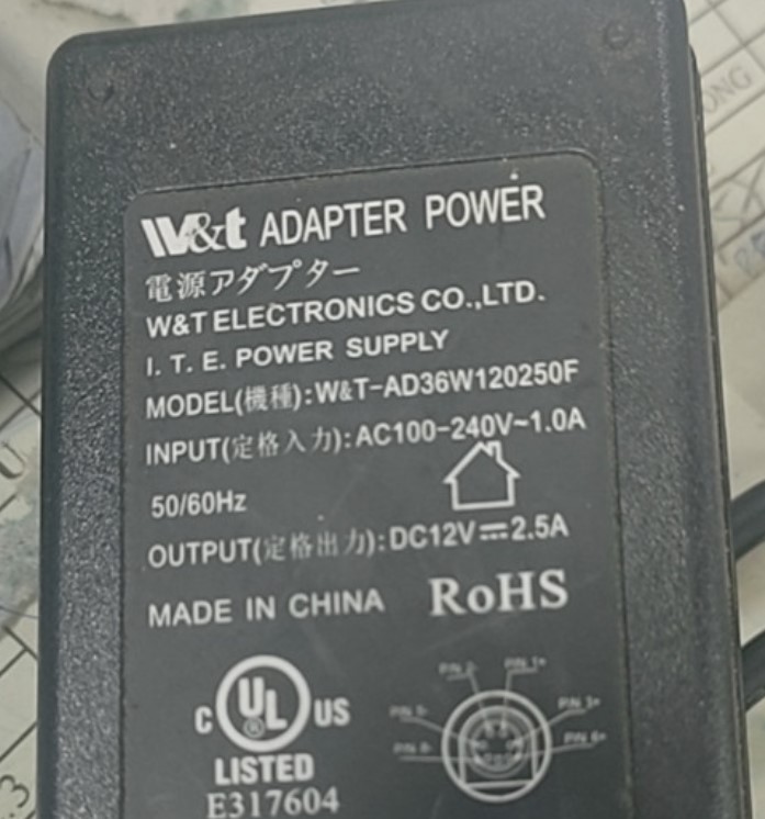 Adapter 12V 2.5A APD OEM W&T Electronics I.T.E. Power Supply W&T-AD36W120250F Connector Size 6 Pin Mini Din Male