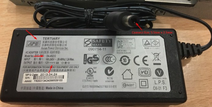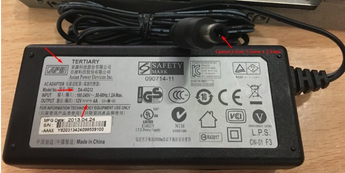 Nguồn điện cấp cho thiết bị: DC Connector Size 5.5mm x 2.5mm