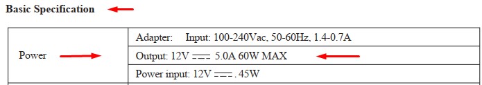 Nguồn điện cấp cho thiết bị: DC Connector Size 5.5mm x 2.5mm