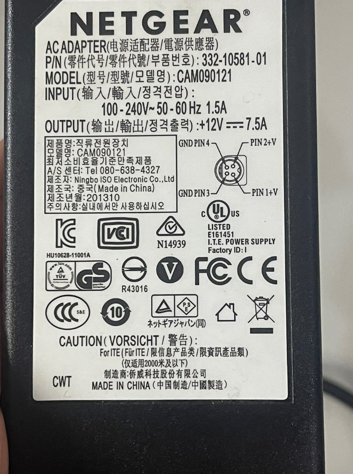Adapter 12V 7.5A NETGEAR CAM090121 Connector Size 4 Pin 10mm Mini Din For Thiết Bị Lưu Trữ Dữ Liệu Netgear RND-4C 4-Bay Network Advanced Storage with 4 trays