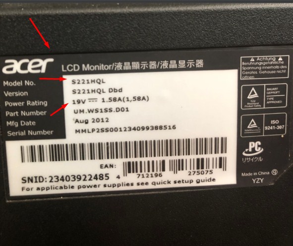 Adapter 19V 1.58A 36W HOIOTO ADS-40SG-19-3 19030G For Acer LCD Monitor S221HQL 21.5 inch Connector Size 5.5mm x 1.7mm