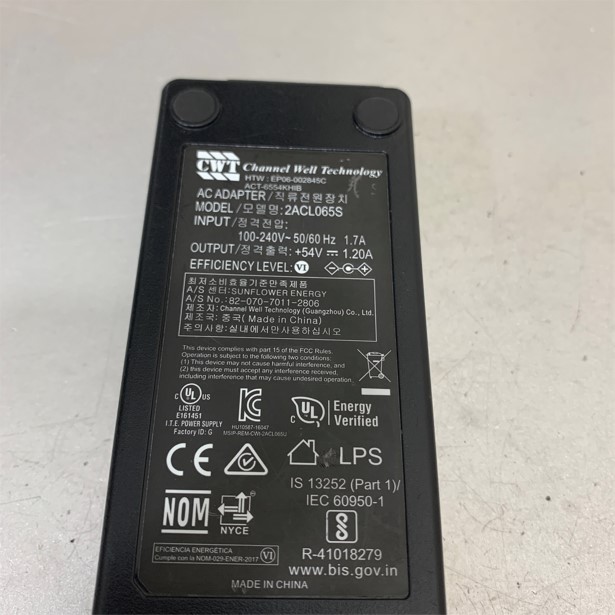 Adapter 54V 1.2A 65W CWT Channel Well 2ACL065S Connector Size 5.5mm x 2.5mm