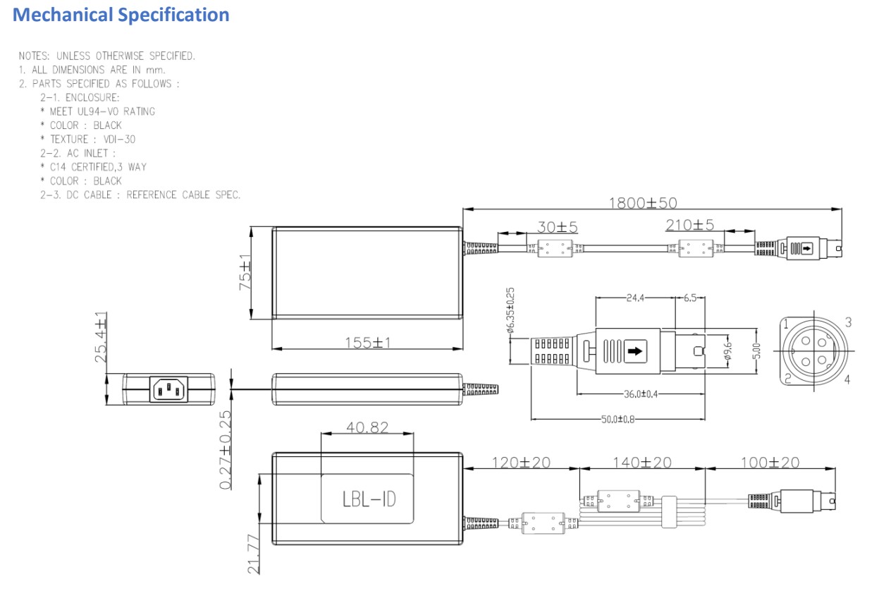Nguồn điện cấp cho thiết bị: DC onnector Tip Size 4 Pin Mini Din 10mm Plug dài 1.8M
