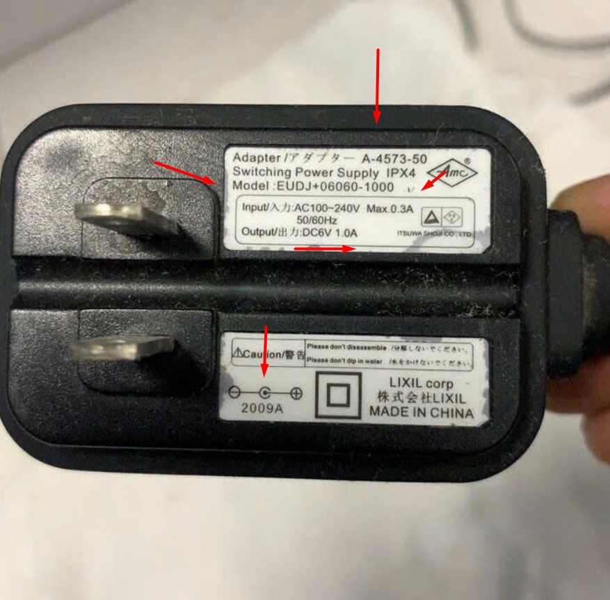 Cắm cứ vào sạc theo thiết bị 6V 1A A-4573-50 IPX4 LIXIL EUDJ+06060-1000 EU Plug Connector Tip Size 4.0mm x 1.7mm