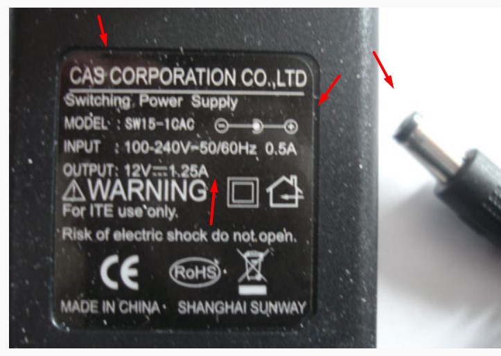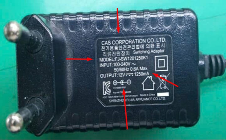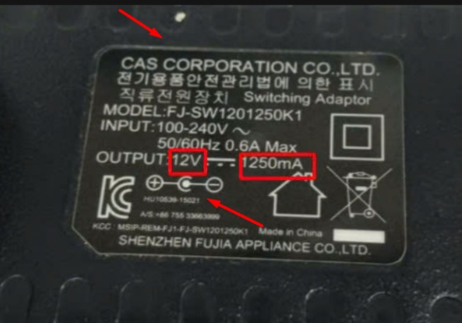 Cắn cứ vào sạc Cas Corporation 12V 1250mA FJ-SW1201250K1 12V 1250mA DC + ---C--- Connector Tip Size 5.5mm x 2.5mm