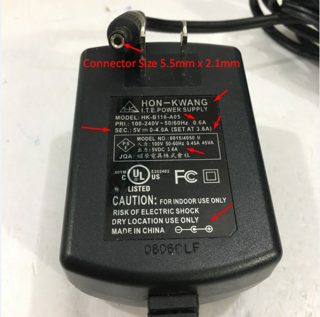 Adapter Original 5V 3.6A 18W HON-KWANG HK-B118-A05 Connector Size 5.5mm x 2.1mm