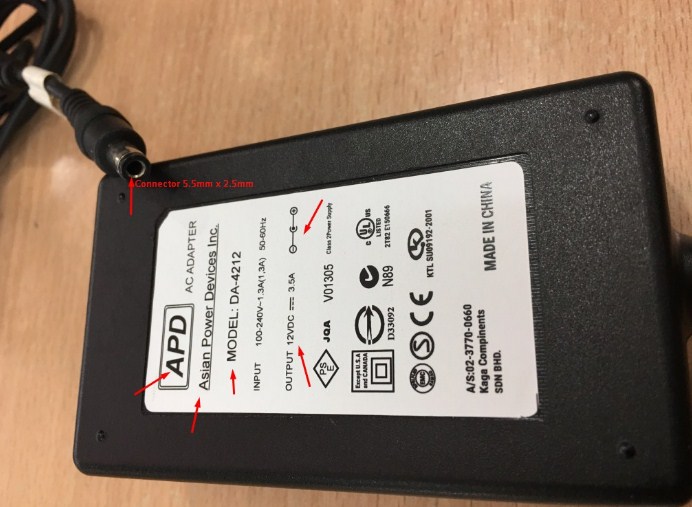 Adapter 12V 3.5A 42W APD Asian DA-4212 Connector Size 5.5mm x 2.5mm