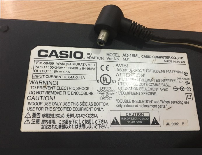 Adapter Original CASIO AD-16ML MJ1 16V 4.5A For Organ Casio Connector Size 6.5mm x 3.0mm
