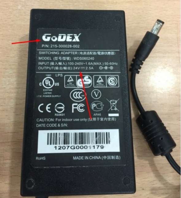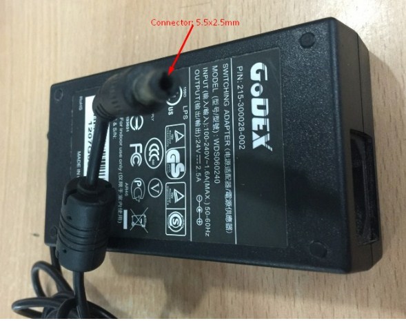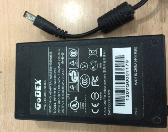Adapter GODEX 215-300028-002, WDS060240 24V 2.5A dùng cho máy in hóa đơn mã vạch quản lý sản phẩm và giá thành sản phẩm.