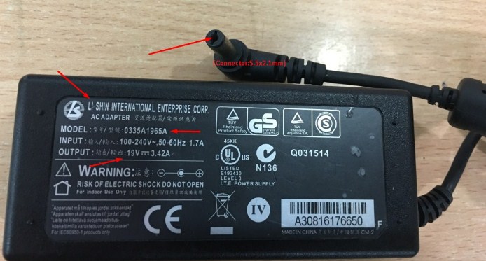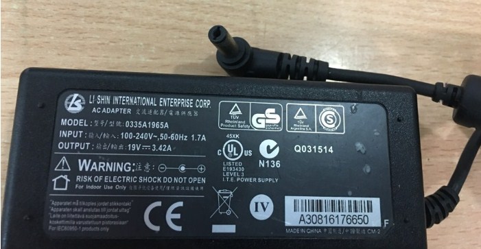 Adapter ORIGINAL LI SHIN 0335A1965A 19V 3.42A For Notebook & Digital DVR AVTECH KPD679ZB Connector Size 5.5mm x 2.1mm