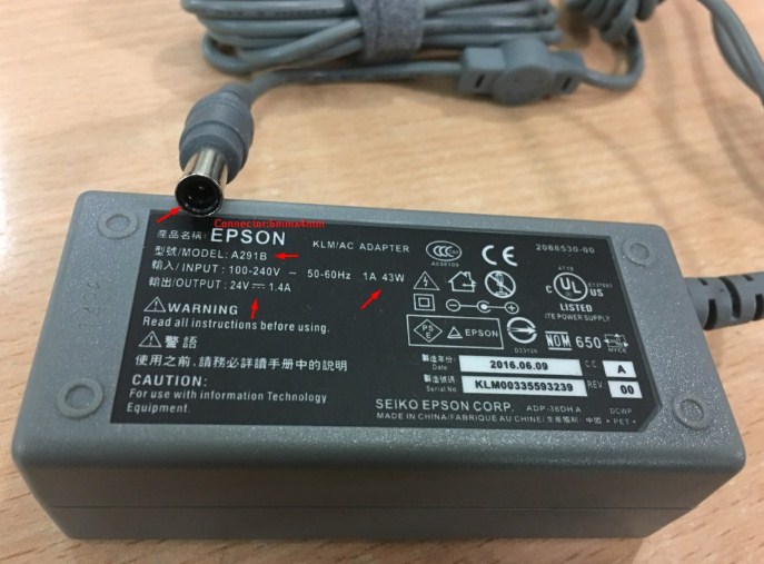 Adapter Scanner Epson A291B 24V 1.4A 43W For 3590 Photo Scanner V500 V600 Epson GT-1500 Connector Size 6.0mm x 4.0mm