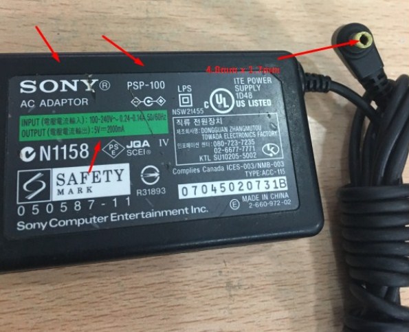 Adapter Sony Original Sony PSP-384 5V 2A For PSP 1000,2000,3000 Connector Size 4.0mm x 1.7mm