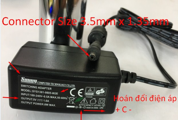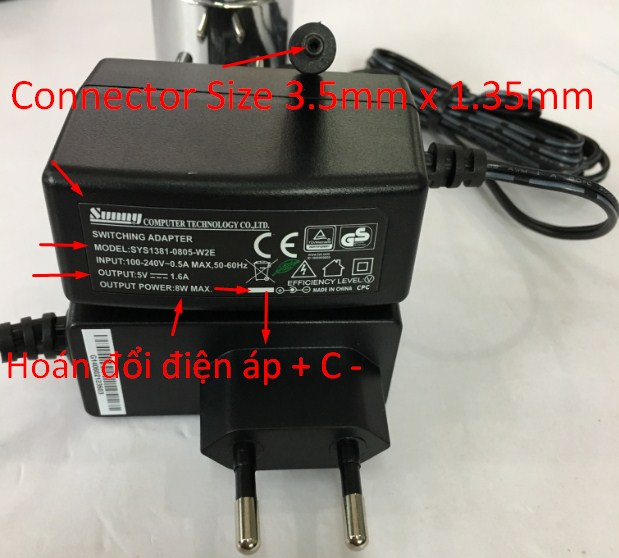 Nguồn điện cấp cho thiết bị: DC Connector Size 3.5mm x 1.35mm cáp dài 1.5M