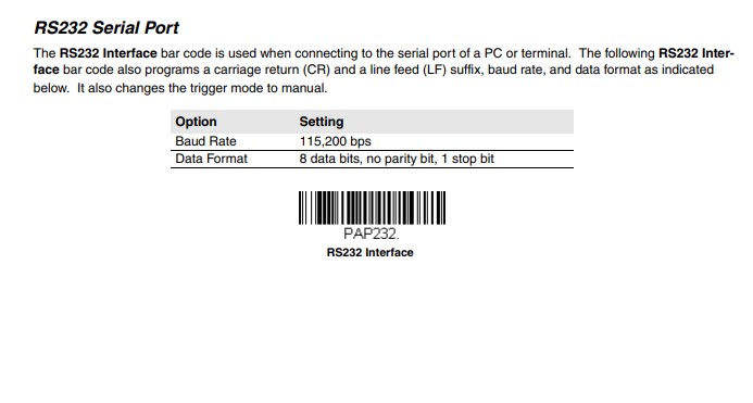 Với một máy đọc mã vạch có kết nối đầu ra RS232, bạn cũng cần phải cài đặt phần mềm ứng dụng để mở và đọc dữ liệu từ cổng nối tiếp RS232 trực tiếp hoặc sử dụng một giao diện phần mềm như các sản phẩm phần mềm RS232 Terminal Software.