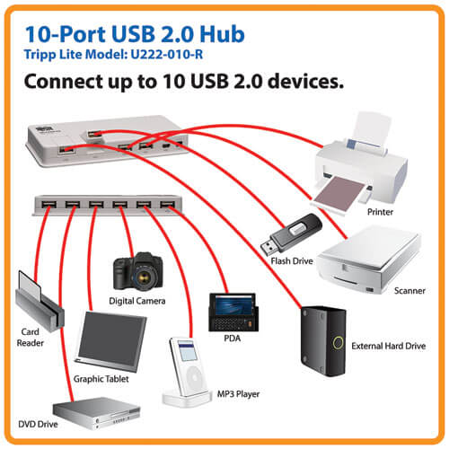 Bộ Chia Cổng 10 Port Hup USB 2.0 Có Sạc Đi Kèm Tripp Lite U222-010-R White For Thiết Bị Hội Nghị Truyền Hình Camera Printer Scanner Hard Drive