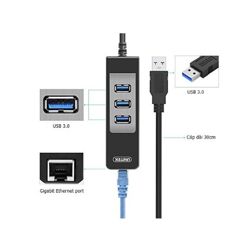 Bộ Chia Cổng Unitek Y-3045 USB 3.0 Hub 3 Ports with 10/100/1000 Mbps Ethernet Network Adapter for Windows Vista Mac Linux