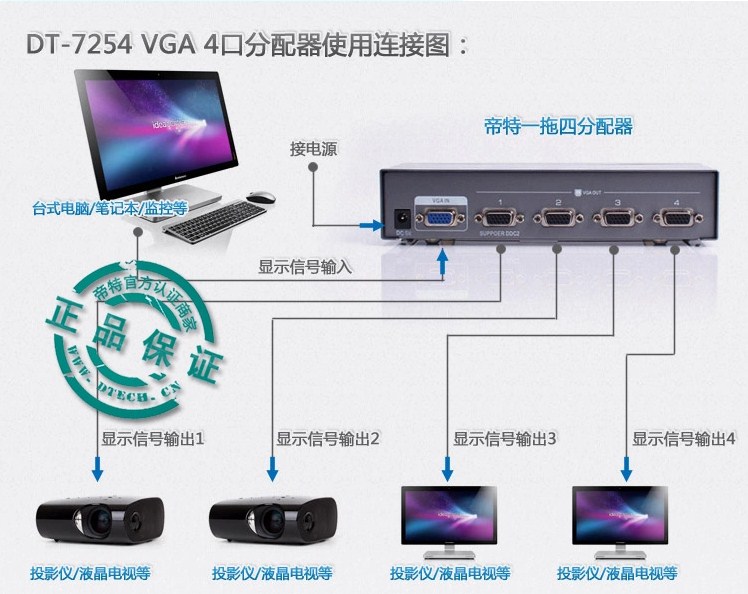 | THAM SỐ SẢN PHẨM: + Tên sản phẩm: Thiết bị chia tín hiệu màn hình VGA. + Hãng sản xuất: DTECH.CHINA. + Model No: DT-7254. + Giao diện đầu vào: 1 kênh VGA DHF. + Giao diện đầu ra: 04 VGA 15 DHF. + Băng thông: 250MHz. + Độ phân giải: 1920x1440. + Tình trạng hàng: Mới. THÔNG TIN & HÌNH ẢNH THIẾT BỊ: Thông số kỹ thuật cơ bản: Đầu vào giao diện: 1 kênh VGA 15DHF Đầu vào và đầu ra giao diện: 4 VGA 15HDF giao diện đầu ra RGB kênh analog: 250MHz băng thông Cấp độ đầu vào: 0.5-1Vp-p Đầu vào trở kháng: 75Ω Mức sản lượng :0.5-1Vp-p Trở kháng đầu ra: 75Ω Kênh đồng bộ ngang và dọc: Cấp đầu vào 0,7-1Vp-p Tần số dòng :30-100K Lĩnh vực tần số :43-120K TTL mức sản lượng tương thích Độ phân giải tối đa hỗ trợ: 1920 × 1440 Khoảng cách truyền dẫn :20-40 mét, việc sử dụng cáp VGA chất lượng cao lên đến 50 mét Công suất (W): 5W Độ ẩm :0-90% hoạt động Nhiệt độ bảo quản: -20-50 ℃ Độ ẩm lưu trữ :0-95% Điện áp: DC-5V Các tính năng: ◆ Cho phép một máy tính để phân chia cùng một hình ảnh lên màn hình 4 / thiết bị chiếu / đầu ra thiết bị video khác; ◆ khoảng cách có thể kết nối lên đến 75m; ◆ Nó là hoàn hảo cho thị trường chứng khoán, triển lãm quốc tế, phòng hội nghị, lớp học và Thương mại Cơ sở vật chất, Trường, phát thanh truyền hình công cộng, nơi mà các tín hiệu video chất lượng cao nhất |