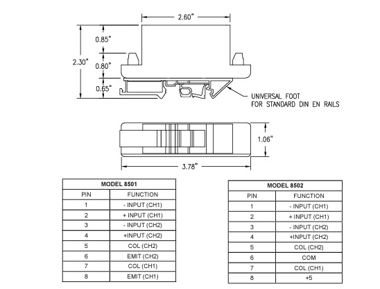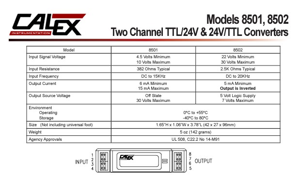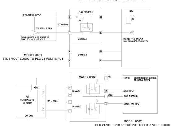 Model 8502 is a two channel converter, 24V to 5V. Each channel requires 7mA into 2.5K ohms to provide a 5mA sinking output to TTL 5 Volt Logic. The output is an optocoupler NPN transistor collector and requires the 5 Volt logic supply and its return. The input frequency range is DC to 20KHz. A typical application is the direction and step control of a Stepper Motor by PLC 24 Volt high speed outputs, where the motor controller requires 5 Volt logic signal levels. The inputs are isolated by optocouplers and are protected from ESD by Varistors. The 2 outputs have a common emitter with each output collector capable of sinking a minimum of 5mA.