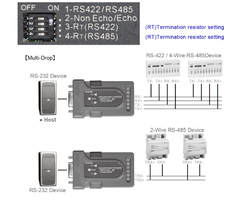 RS-422 / RS-485 Termination resister Rs-485 Echo-mode: Controlled by Dip Switch