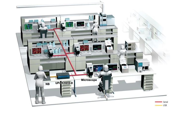 Các nhà khoa học y tế và nhà nghiên cứu dược phẩm dựa vào thiết bị thí nghiệm tinh vi để khám phá các phương pháp điều trị mới cho người bệnh. Hầu hết các nghiên cứu được thực hiện theo nhóm do sự phức tạp và tính chất hợp tác của khoa học y tế. Các nhà khoa học thường chuyển hình ảnh và dữ liệu từ kính hiển vi và các thiết bị khác cho mỗi máy tính xách tay hoặc máy tính để bàn của người khác. Kết nối tất cả các phần này của thiết bị thường yêu cầu nhiều cổng nối tiếp, mỗi cổng một thiết bị ngoại vi. Vì máy tính chỉ được trang bị hạn chế số lượng cổng nối tiếp, mở rộng kết nối USB thành nhiều các cổng nối tiếp có thể cung cấp cho các nhà nghiên cứu khả năng kết nối mà họ cần tạo ra bước đột phá khoa học tiếp theo của họ. Giải pháp của Moxa là UPort®