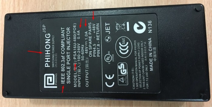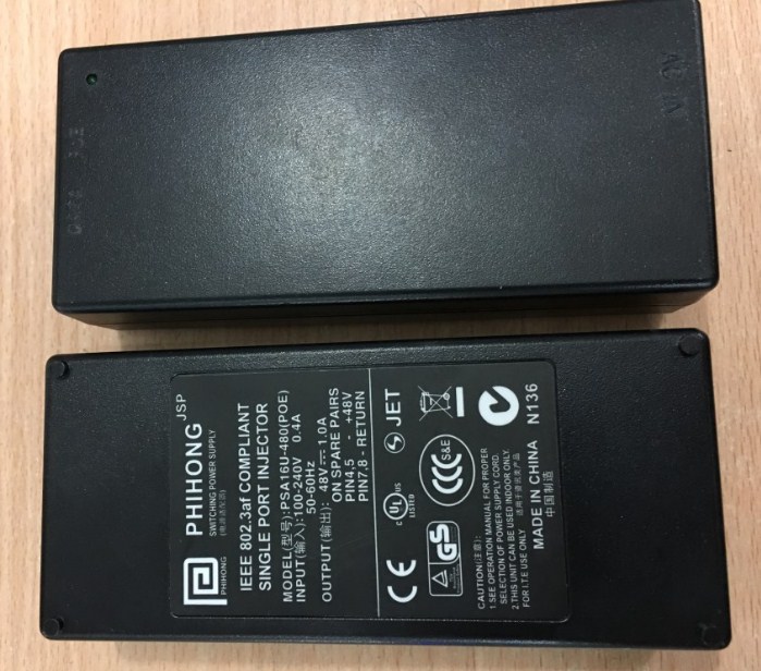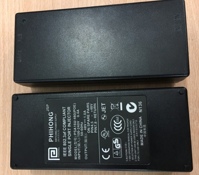 Ghi chú: Bộ chuyển nguồn chính hãng PHIHONG PS16U-480 48V 1A 48W POE injector POE Adapter đi kèm với một sợi dây nguồn trong sau loại cáp nguồn như hình trên để người dùng hợp nhất với ổ căm điện.
