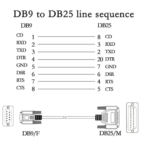 DB9 pin 1 to DB25 pin 8, DB9 pin 2 to DB25 pin 3, DB9 pin 3 to DB25 pin 2, DB9 pin 4 to DB25 pin 20, DB9 pin 5 To DB25 pin 7, DB9 pin 6 to DB25 pin 6, DB9 pin 7 to DB25 pin 4, DB9 pin 8 to DB25 pin 5, Serial computer