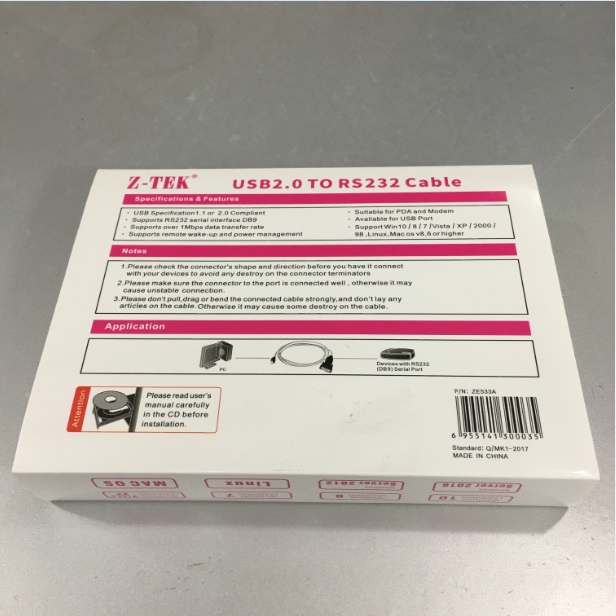 Cáp chuyển đổi nối tiếp USB 2.0 sang RS232 nối tiếp Z-TEK ZE533A FTDI chipset chuyển đổi công USB trên máy tính Notebook, Desktop Computer không có cổng RS232 thành cổng RS232 Com nối tiếp. Dùng điều khiển Console Cisco, DATA, up software download….PLC, CNC….đầy đủ và tín hiệu dữ liệu RS-232 và lấy nguồn điện trực tiếp từ cổng USB được kết nối. Có khả năng hỗ trợ tốc độ truyền dữ liệu lên đến 1Mbps / giây, phù hợp để sử dụng với kết nối. Hỗ trợ nhiều thiết bị nối tiếp, thiết bị, bộ điều khiển truy cập, PLC công nghiệp, điều khiển IO, bộ ghi dữ liệu, SMS từ xa, nối tiếp PABX, tự động PABX, nâng cấp firmware / Nhấp nháy như OpenBox, SKybox, Dreambox, v.v.