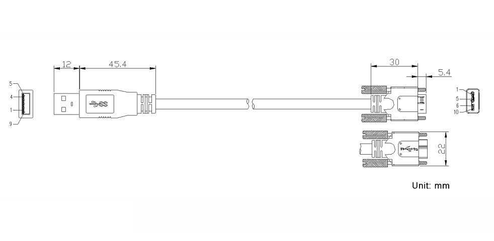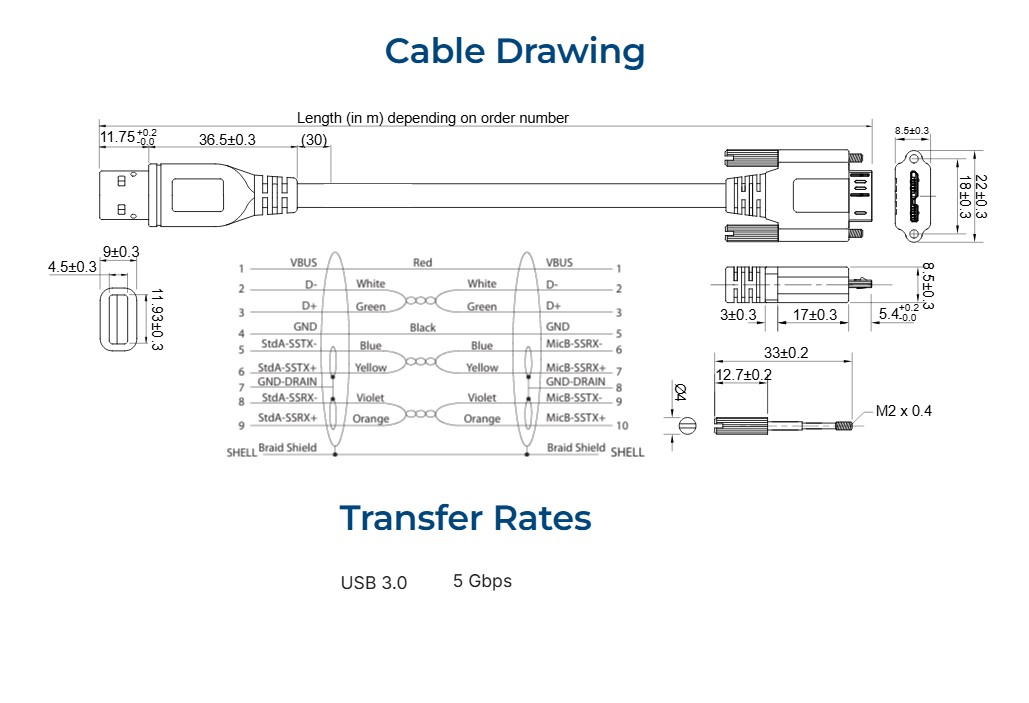Camera-side Connector: USB 3.0 Micro B with screw lock