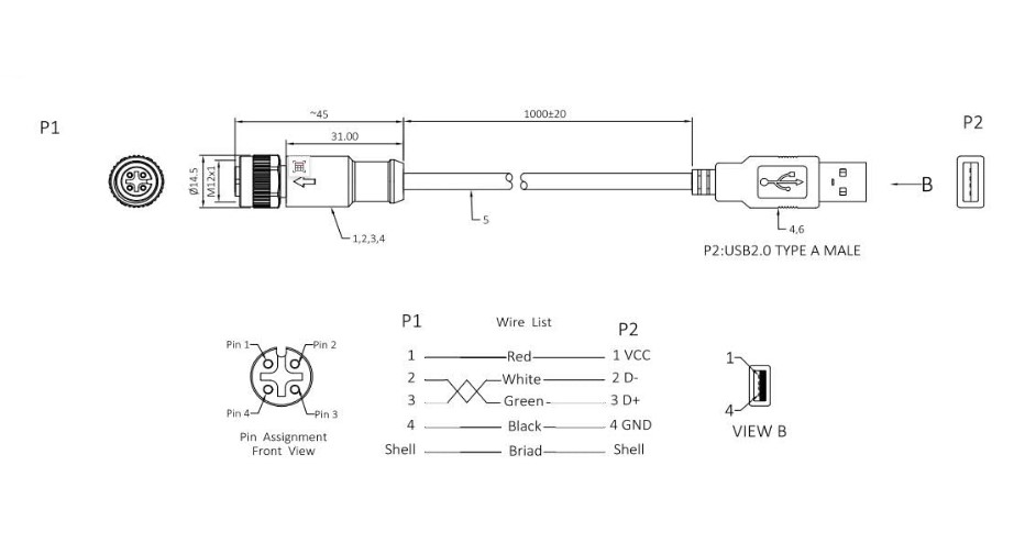 PartNumber: M12 4 Pin A-Code Female to USB 2.0 Male Cable