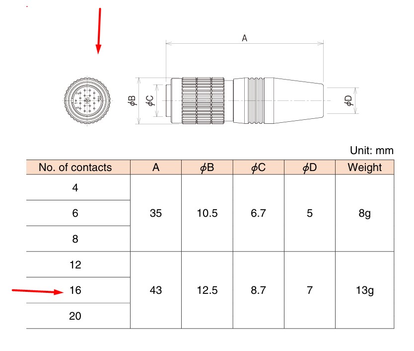 Connector 2: Hirose HR25-9TJ-16S 16 Pin Female Connector