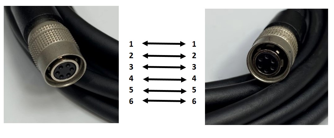 Pin-Out: Hirose HR10-7P-6P(73) Connection: 1-1, 2-2, 3-3, 4-4, 5-5, 6-6.