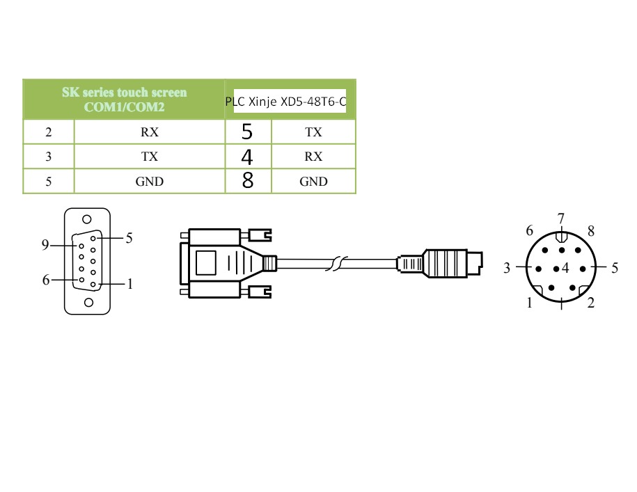 Model: SK series touch screen uses DB9F Connector Xinje XD5-48T6-C PLC terminal is MD8M Communication Cable RS232