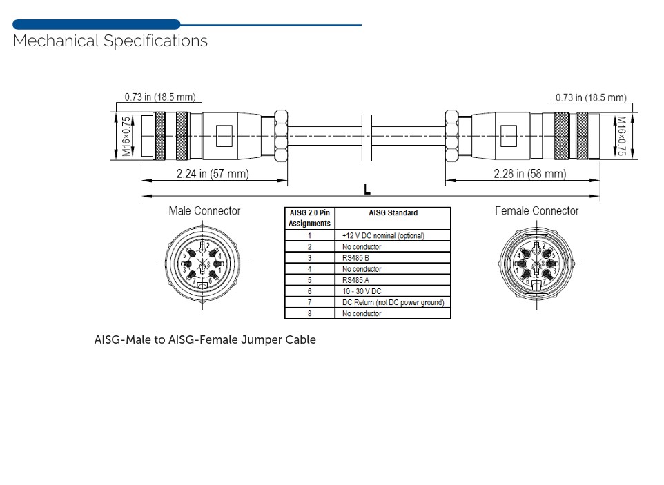 Connector Interfaces:Terminated AISG 8‐pin socket screw lock male and female