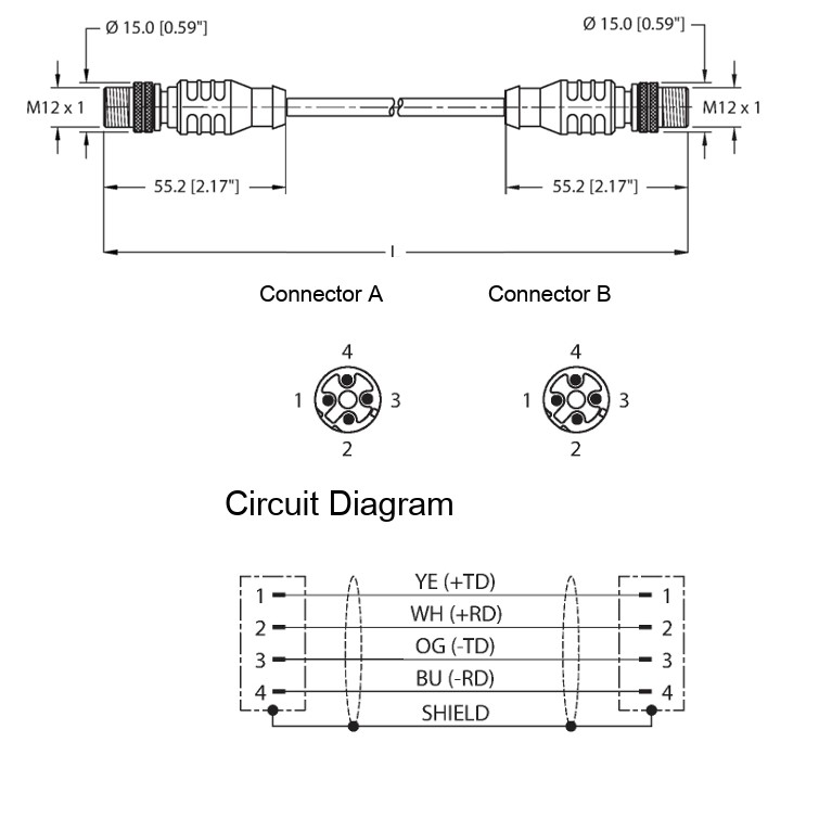 Connector 1: M12 D-Code 4 Pin Male Straight