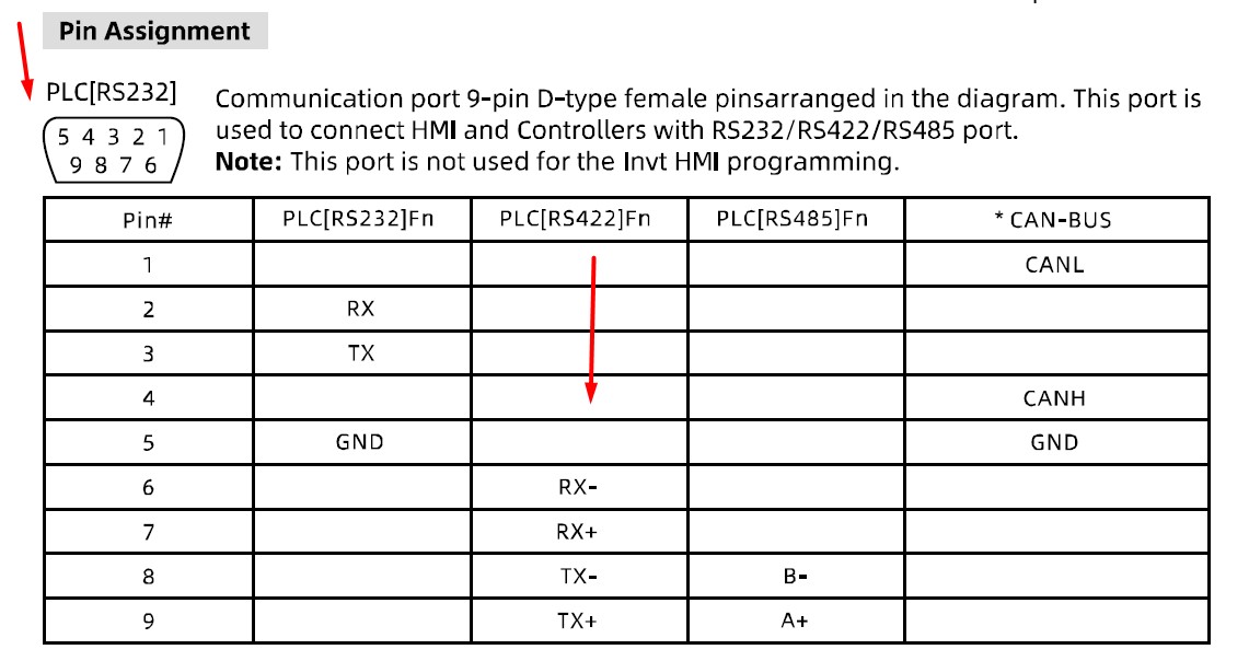 INVT HMI VS Series Pin Assignment DB9 Male Port