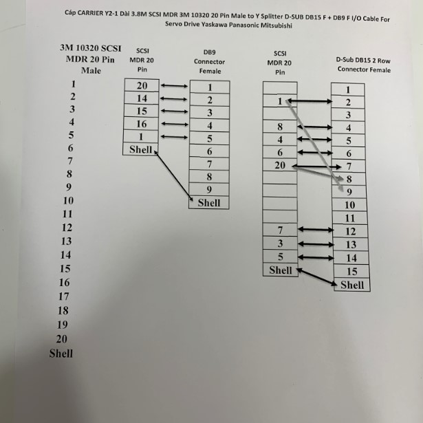 Cáp CARRIER Y2-1 Dài 3.8M SCSI MDR 3M 10320 20 Pin Male to Y Splitter D-SUB DB15 F + DB9 F I/O Cable For Servo Drive Yaskawa Panasonic Mitsubishi