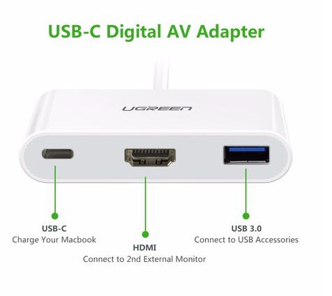 Bộ chuyển đổi AV kỹ thuật số USB loại C của Ugreen được thiết kế để kết nối các máy tính mới được phát hành như MacBook 2015 hoặc Google Chromebook Pixel với HDTV, màn hình hiển thị hoặc máy chiếu có giao diện HDMI ở độ phân giải lên tới 4K và full HD 1080P trong khi sạc USB-C của bạn Thiết bị đồng thời. Nó được dùng để xuất nội dung do người dùng tạo ra như thuyết trình và tài liệu làm việc, nó cũng có thể hoạt động để tăng năng suất của bạn bằng cách mở rộng máy tính để bàn của bạn lên màn hình phụ, nhân đôi không gian làm việc có sẵn. Hơn nữa, bạn cũng có thể kết nối các phụ kiện USB với máy tính xách tay USB-C của mình, như ổ đĩa flash, bàn phím, bộ chia USB, chuột, v.v ... Đây là một lựa chọn lý tưởng cho chủ sở hữu Macbook mới