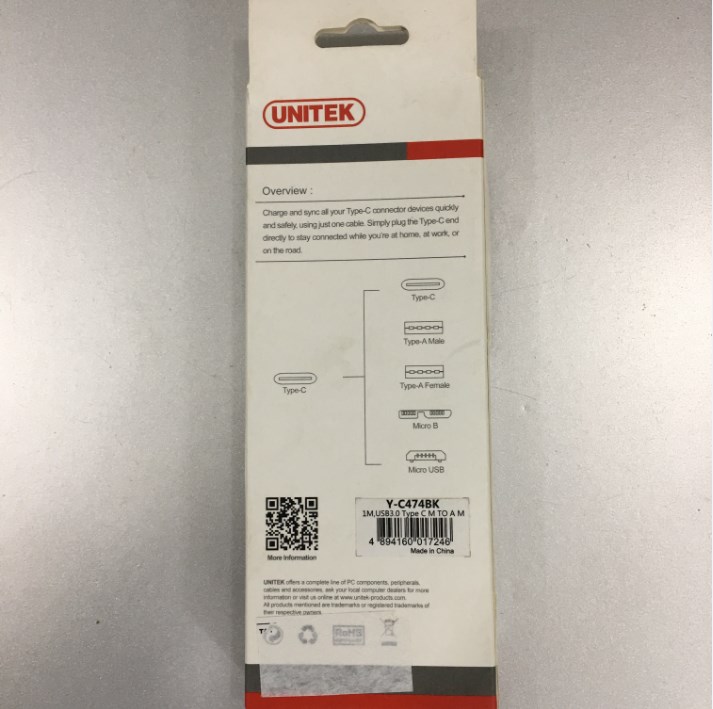 Cáp Chuyển Đổi USB Type C to USB 3.0 Chính Hãng Unitek Y-C474BK Length 1M