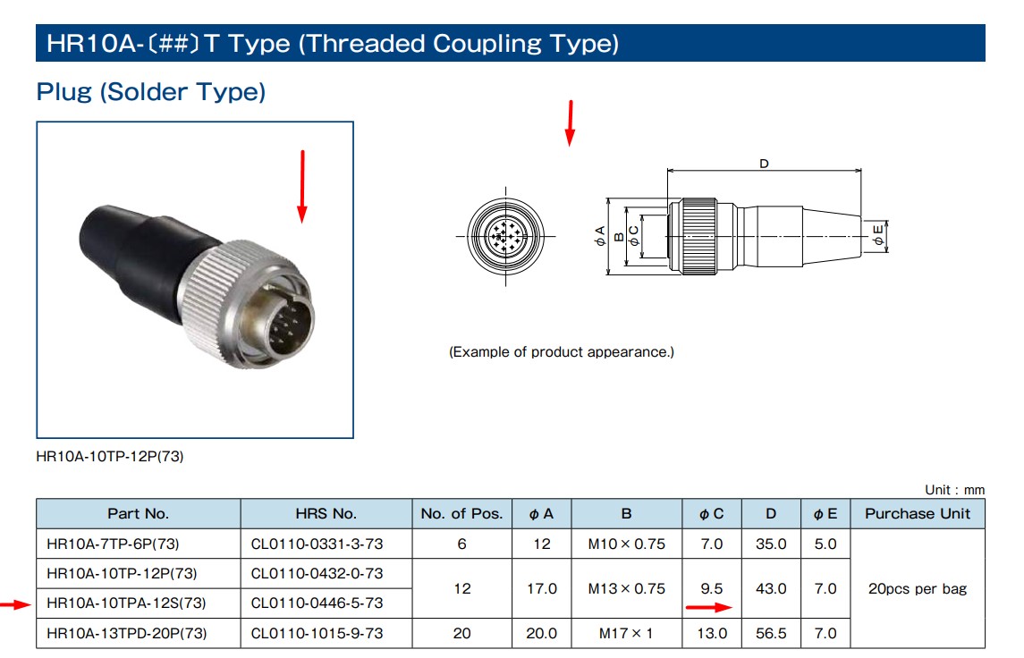 HR10A-10TP-12P(73) Plug (Solder Type) - HR10A-10TPA-12S(73) Plug (Solder Type)