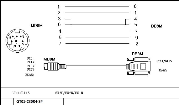 Cáp điều khiển chât lượng cao PLC Programming Mitsubishi GT01-C10R4-8P RS422 FX Mini Din 8 pin Male to RS232 DB9 Male and GOT1000 HMIs GT11 GT15 RS422 (Black) length 3M Cáp kết nối GT01-C10R4-8P dùng để truyền thông từ PLC Mitsubishi dòng FX series: FX0/FX1N/FX2N/FX3U với màn hình GOT1000 HMIs Mitsubishi Cổng RS232- DB9 chân cắm vào màn hình GOT Mitsubishi và cổng Mini 8 chân tròn cắm vào FX0/FX1N/FX2N/FX3U Thiên Trường nhận cung cấp các loại cáp PLC Programming với các chuẩn kết nối khác nhau, của các hãng PLC với sơ đồ kết nối nhà sản xuất cung cấp hoặc khách hàng cung cấp với nguyên liệu cáp kết nối tốt nhất để người sử dụng an tâm khi điều khiển thiết bị. Cáp có vỏ bọc lưới bện nhiều sợi trống nhiễu vỏ bạc cách nhiệt sợi cường lực bằng vải sợi đẫn bằng đồng bện nhiều sợi. Cáp được sử dụng với hãng IEEE 1394 800 C 30V