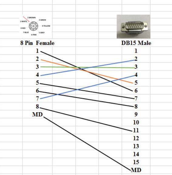 Wiring diagram Connector M12 8 Pin A-Code Female to D-Sub DB15 Male Cable