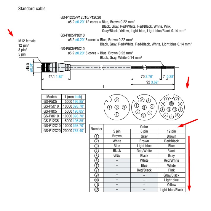 Cáp Điều Khiển Keyence GS-P12C5 Dài 5M 17ft Connector M12 12 Pin Female to 12 Core Bare Wire Open End For Safety Interlock Switches GS Series