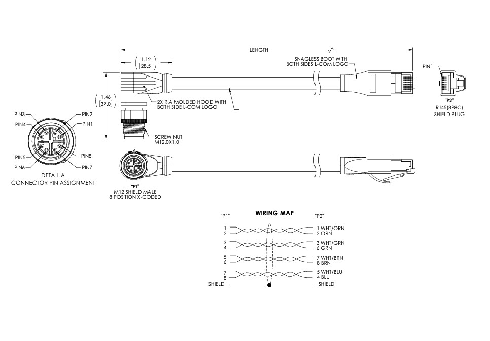 Wiring Diagram M12 X-Coded 8 Pin Male to RJ45 GigE Ethernet Cable