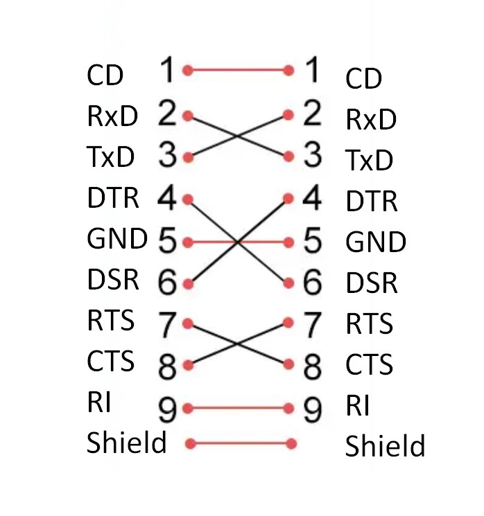 Pin-Out: Cros Connection: 1-1 / 2-3 / 3-2 / 4-6 / 5-5 / 6-4 / 7-8 / 8-7 / 9-9 / Shield-Shield