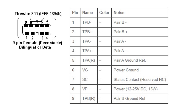 | Connector B | 1 - FireWire 800 (9 pin, IEEE 1394b) Male | |