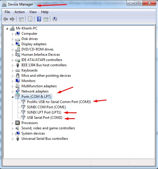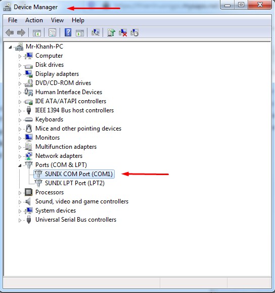 Trên hầu hết các PC có một cổng COM tích hợp duy nhất, cổng sẽ xuất hiện với Windows dưới dạng COM1 tuy nhiên điều này không phải lúc nào cũng đúng. Nếu cân điện tử của bạn sử dụng kết nối USB hoặc nếu bạn đang sử dụng bộ chuyển đổi RS232 sang USB, bạn sẽ cần xác định số cổng COM mà thiết bị được kết nối. Cách tốt nhất để làm điều này là tìm trong Trình quản lý thiết bị Windows trong phần có nhãn "Cổng (COM & LPT)". Phần này sẽ chứa danh sách tất cả các cổng COM được cài đặt trên PC của bạn.