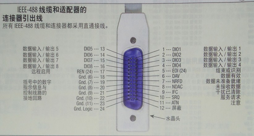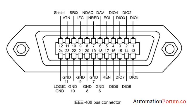 IEEE-488 Cáp Cấu Trúc GPIB Giao diện hệ thống sử dụng che chắn GPIB cáp giữa máy tính và Instruments. Cáp này bao gồm 24 Pin cáp và hai đầu kết nối, mỗi trong số đó bao gồm một cắm và một ổ cắm. 24 Pin được chia thành 8 đường dữ liệu (DIO1-8), 3 cái bắt tay đường tín hiệu (NRFD/NDAC và DAV), 5 giao diện quản lý đường tín hiệu (ATN/IFC/REN/SRQ/EOI), và 8 đất đường (488 cáp/IEEE 488 cáp).Các GPIB IEEE-488 đường tiếp liệu GPIB cáp.