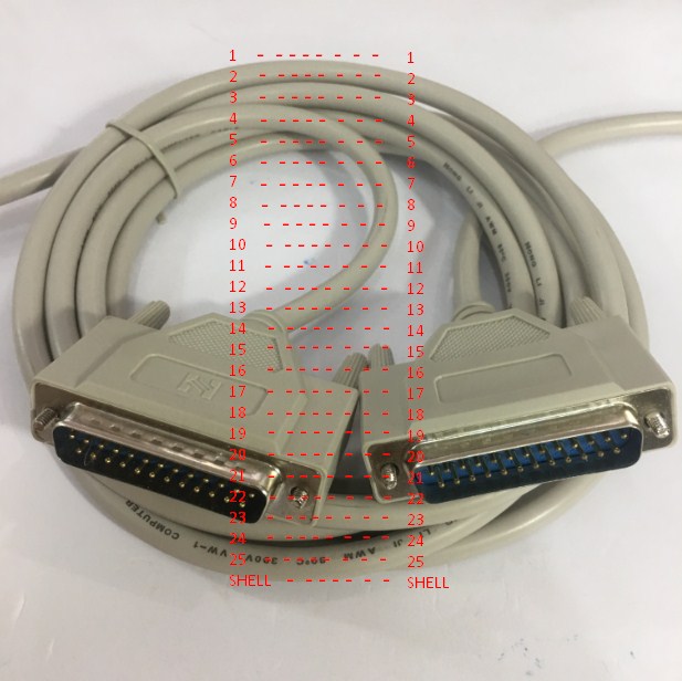 Cáp DB25 Male to Male thường được sử dụng cho các thiết bị ngoại vi nối tiếp như, máy in, máy quét, máy PLC, CNC, máy chiếu ILDA và nhiều thiết bị khác. Các đầu nối được đúc hoàn toàn với đai bắt vít tay cái cung cấp cho bạn một kết nối nhanh chóng và dễ dàng. Cáp DB25 Male to Male được nối dây với tiêu chuẩn thông qua sơ đồ chân sau: 1-1; 2-2; 3-3; 4-4; 5-5; 6-6; 7-7; 8-8; 9-9; 10-10; 11-11; 12-12; 13-13; 14-14; 15-15; 16-16; 17-17; 18-18; 19-19; 20-20; 21-21; 22-22; 23-23; 24-24; 25-25; SHELL –SHELL.