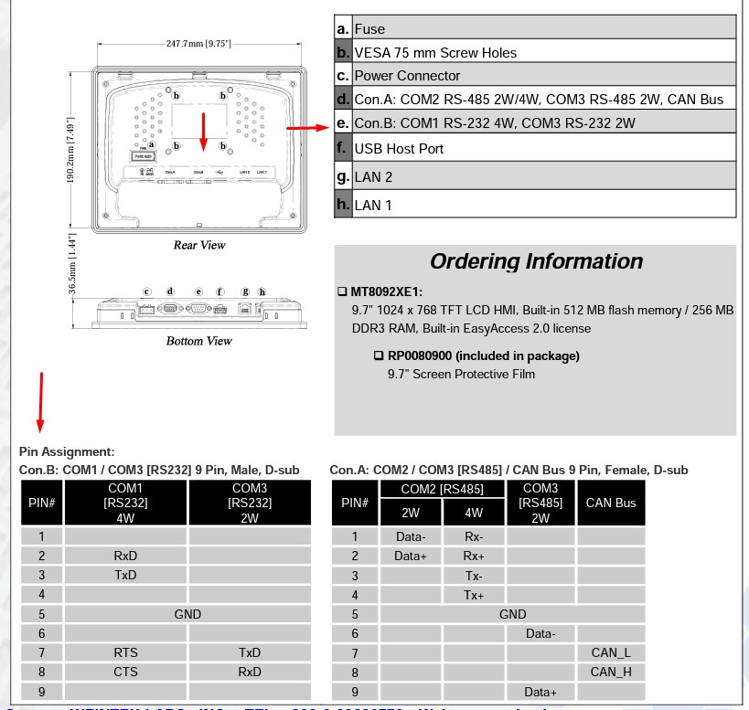 COM Port: Con.A: COM2: RS-485 2W/4WCOM3: RS-485 2W