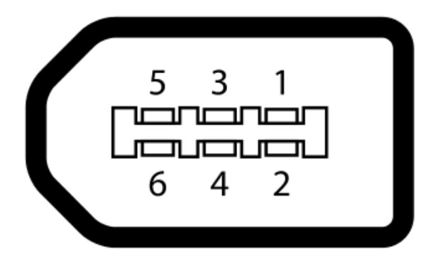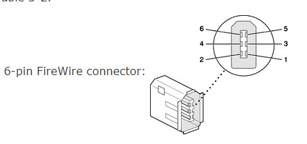 Pin assignments on the 6-pin FireWire connector |